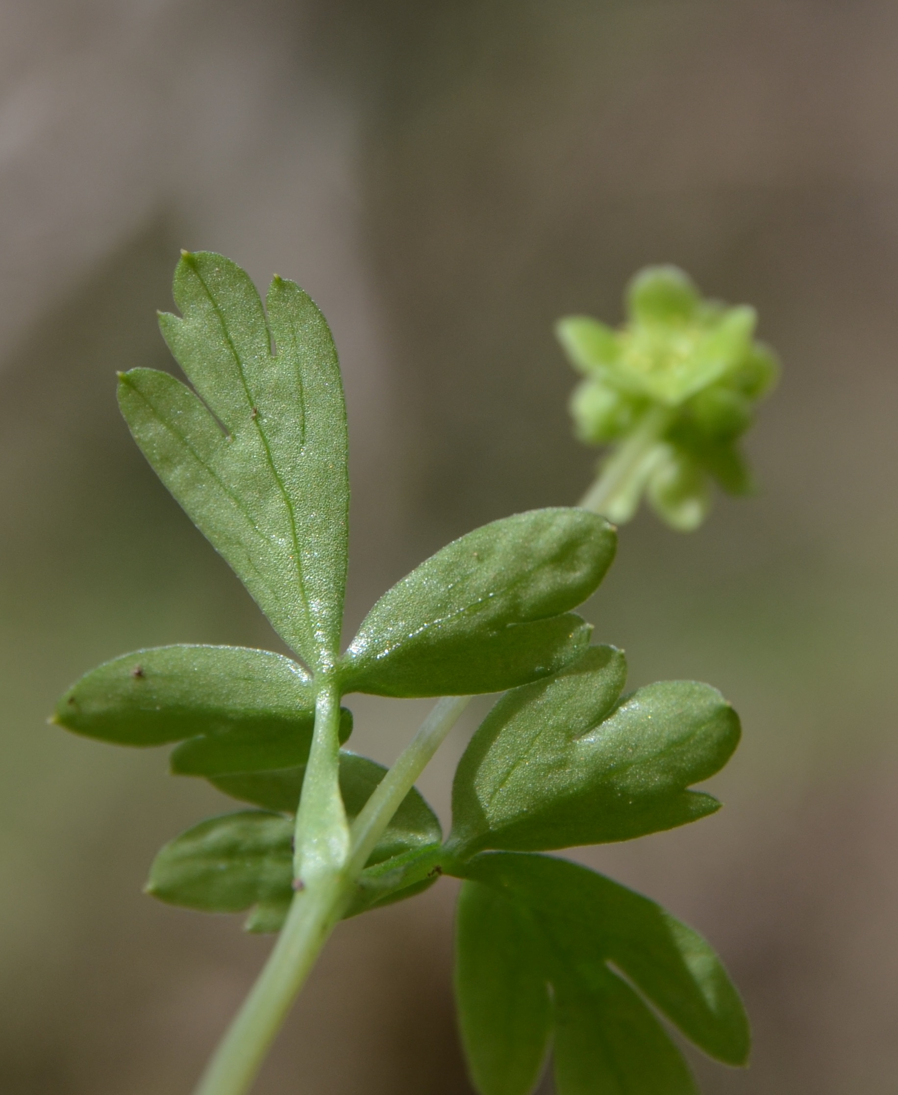 et luisante. Elle a une faible odeur de musc. Les feuilles de la base sont découpées (2 fois ternées) avec un long pétiole