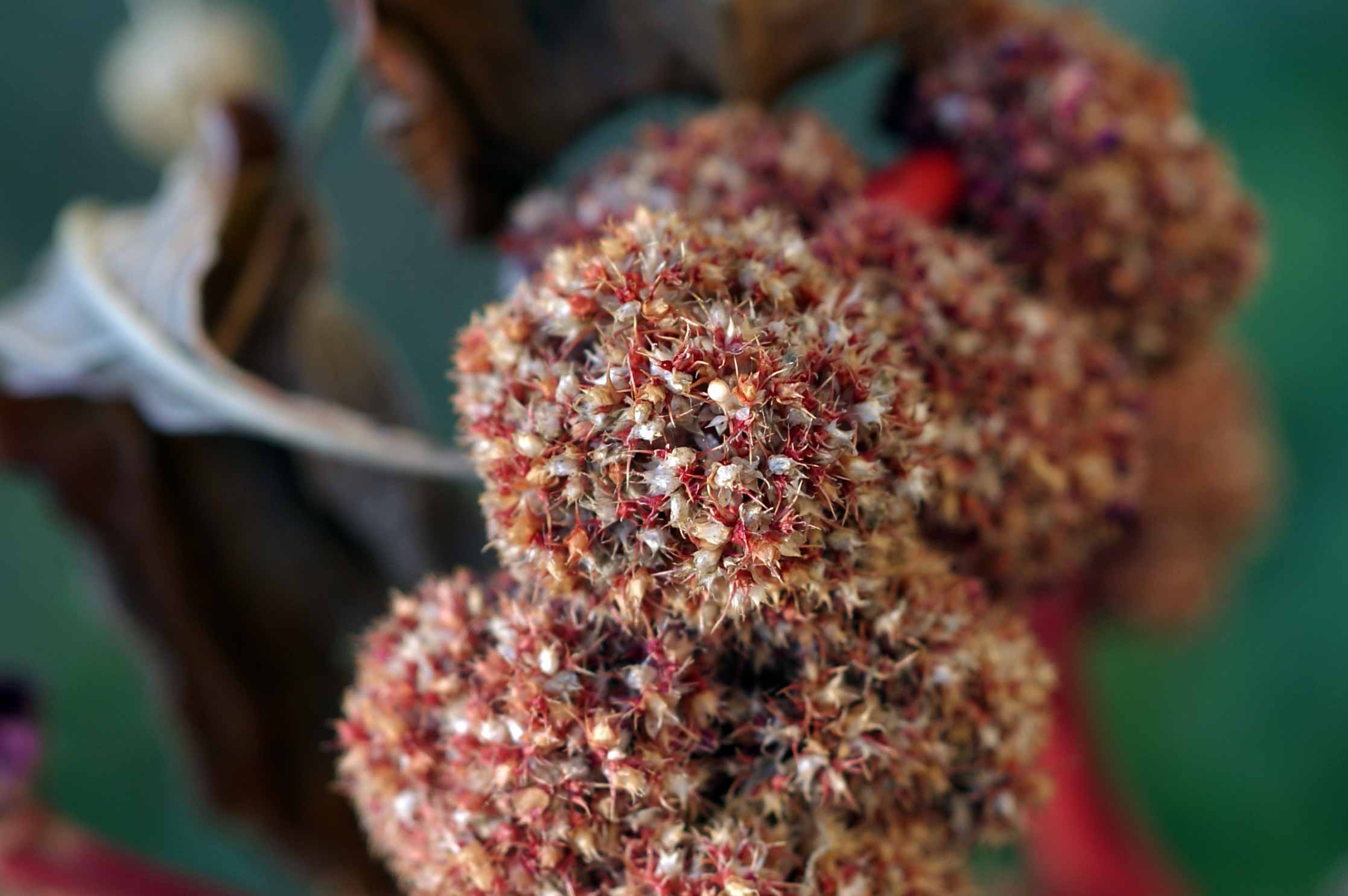 en longue panicule pendante non feuillée aux fleurs d’un rouge vif. Plante naturalisée, originaire des Indes Orientales.